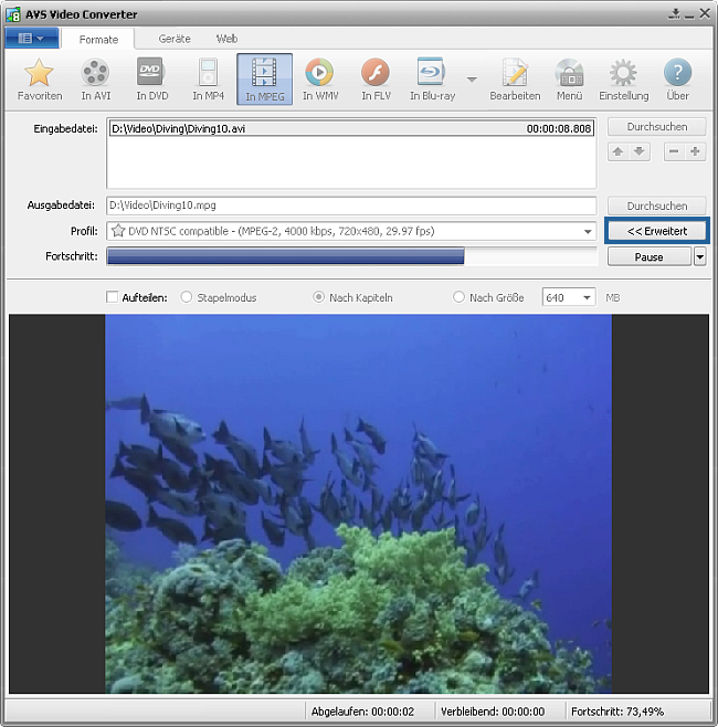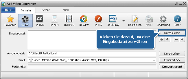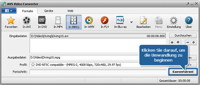 Möchten Sie Ihre Heimvideos in andere Videoformate konvertieren? Der AVS Video Converter erlaubt Ihnen Heimvideos in DivX, Xvid, AVI, MPEG, WMV, MOV und andere Formate umzuwandeln und auf Ihrem PC zu speichern.