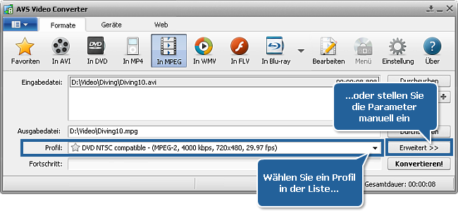 ist. Bitte lesen Sie die Online-Hilfe , um mehr darüber zu erfahren, wie man DVDs mit Heimvideos in andere Videoformate umwandeln kann.Nachdem Sie eine Eingabevideodatei gewählt haben, klicken Sie auf einen der Buttons auf der Registerkarte Formate. In der Liste mit Profilen (Feld Profil) wählen Sie eines der verfügbaren Profile. Man kann auch auf den Button Erweitert >> klicken, um die Profilparameter im Bereich Ausgabedatei der geöffneten Registerkarte Umwandlungsoptionen manuell einzustellen.